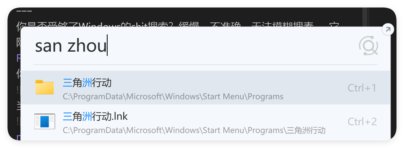 你是否受够了Windows的shit搜索?缓慢、不准确、无法模糊搜素……它除了能使用WIN键打开以外我找不到任何一个优点。