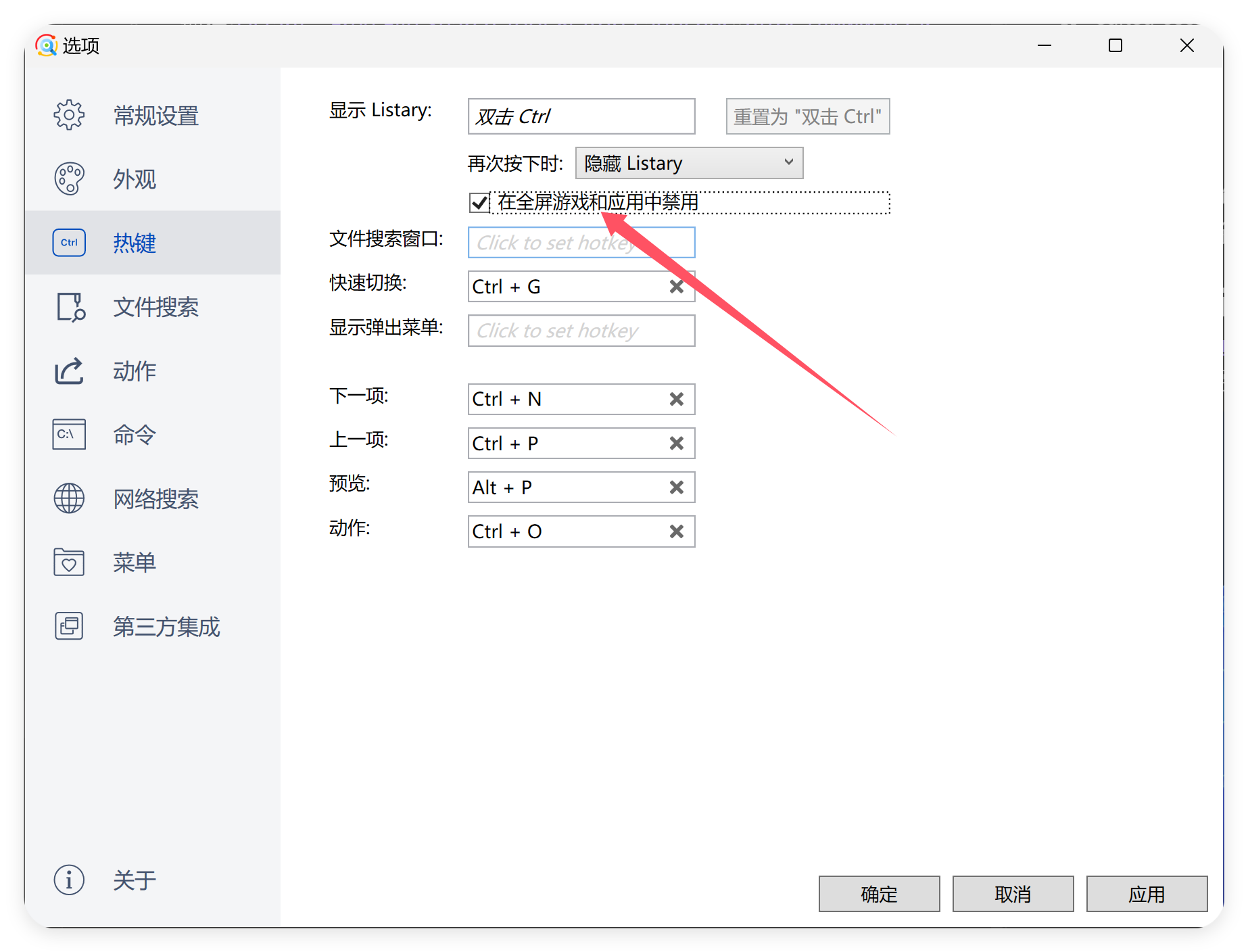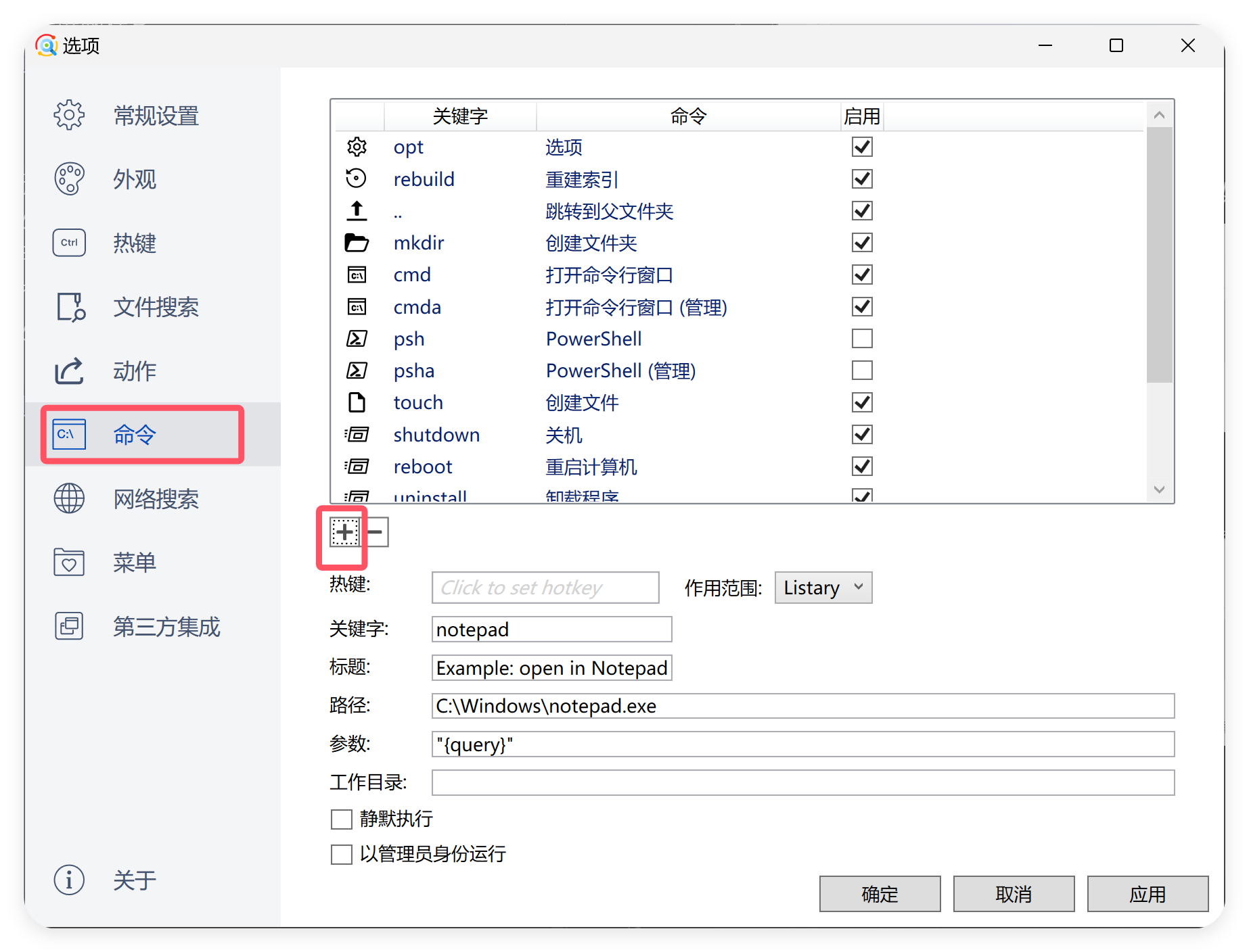 在这里,你可以非常方便的设置你的热键与对应的自定义命令: