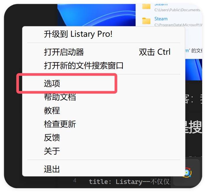 Listary给我提供了另一个无与伦比的便利——自定义命令,它可以将自定义热键绑定在你的自定义命令上!比如打开终端这件事情。在Ubuntu上,我从来都是使用Ctrl+Alt+T来打开终端的,但是在WIndows上,我已经受够了使用Win+R再加cmd来打开它了。这无疑是缓慢的。要设置自定义命令,你需要找到你的Listary程序,右键打开选项: