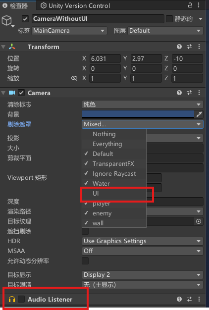 我们要在场景中创建第二个相机,然后关闭它的Adiuo listener(我好像打错了,不过你应该能意会),然后将它的剔除遮罩中的UI取消勾选,并将你的UI图层设置为UI注意是图层,不是排序图层
