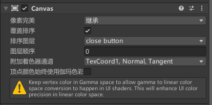 我曾经因为没有使用 Graphic Raycaster导致按钮始终无法点击,去判断为是图层顺序问题而改了一个多小时的经历。为我们的UI精灵添加这些组件之后,我们只需要设置Canvas为覆盖排序,并设置它的排序图层就好了。参考设置: