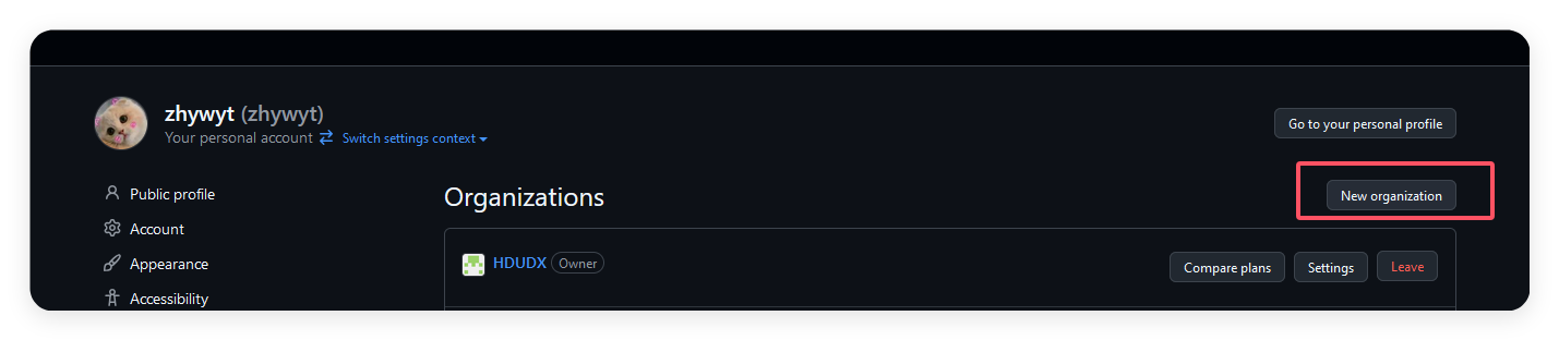 找到组织页面,创建一个新的组织,名字依据你们组织来定,我为杭电定向队创建: