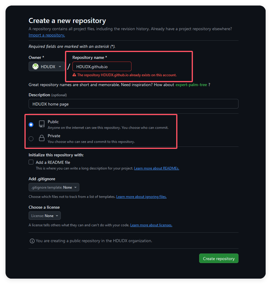 需要注意的是你的仓库名设置为<组织名>.github.io,这与你的page类似。然后设置为公开的。