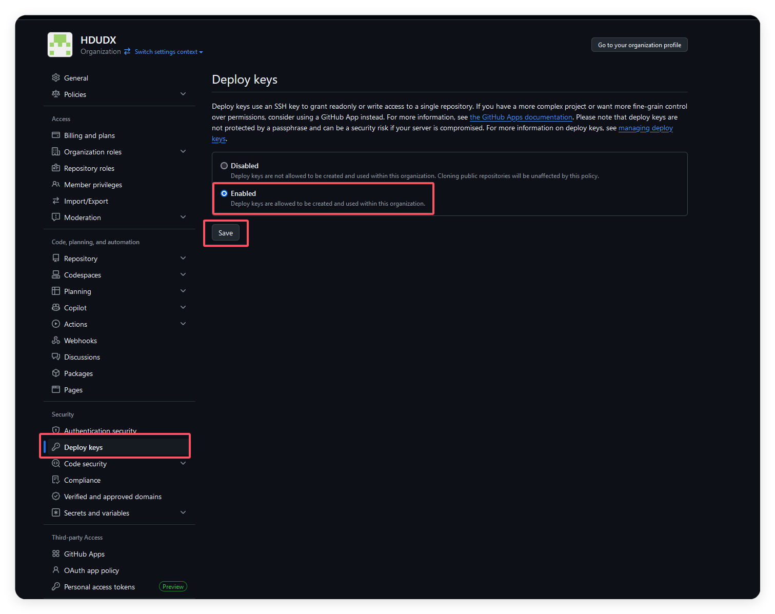 找到你的组织的设置->DeployKeys->Enable->Save
