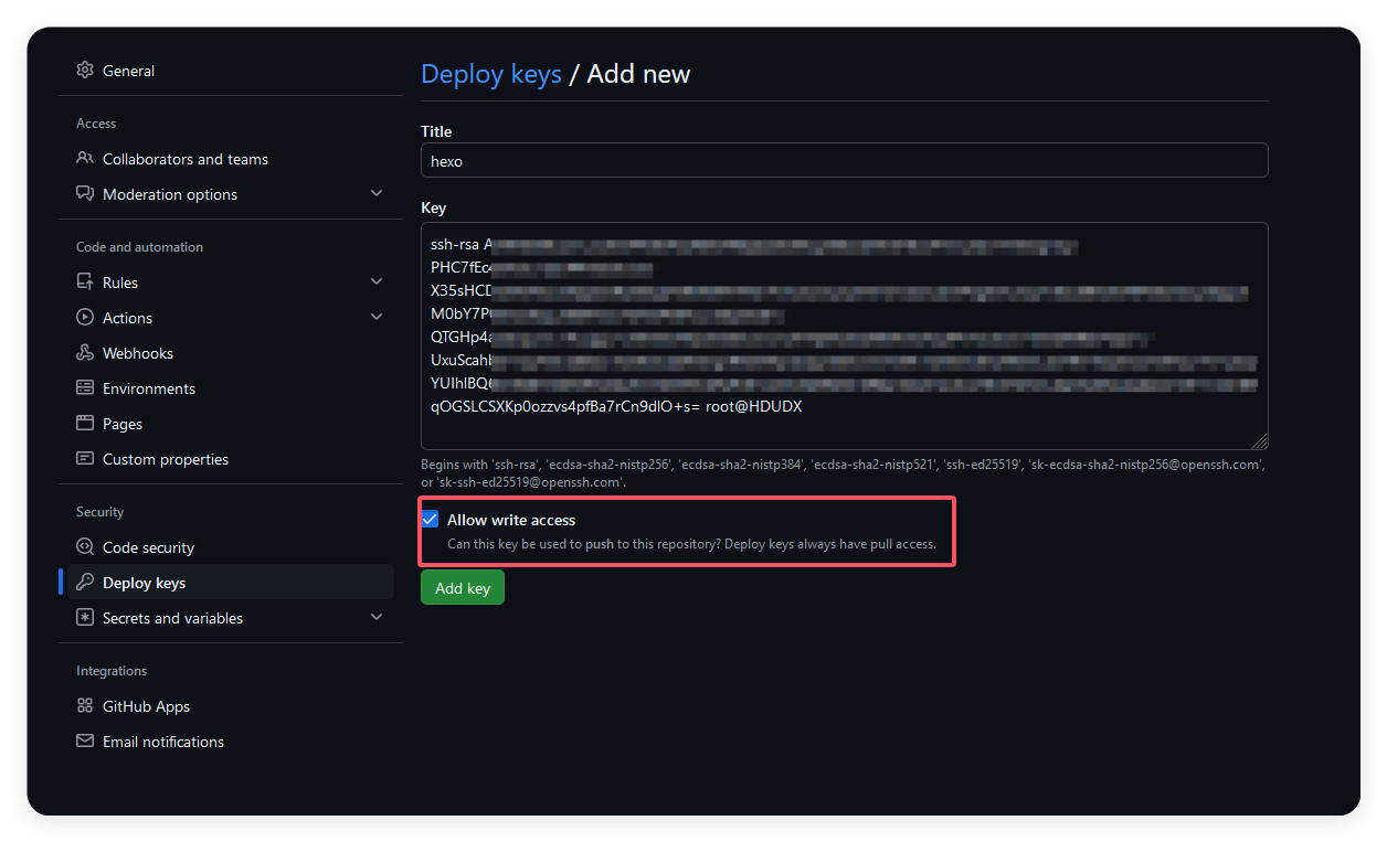将我们机器的公钥填入,并勾选允许写访问