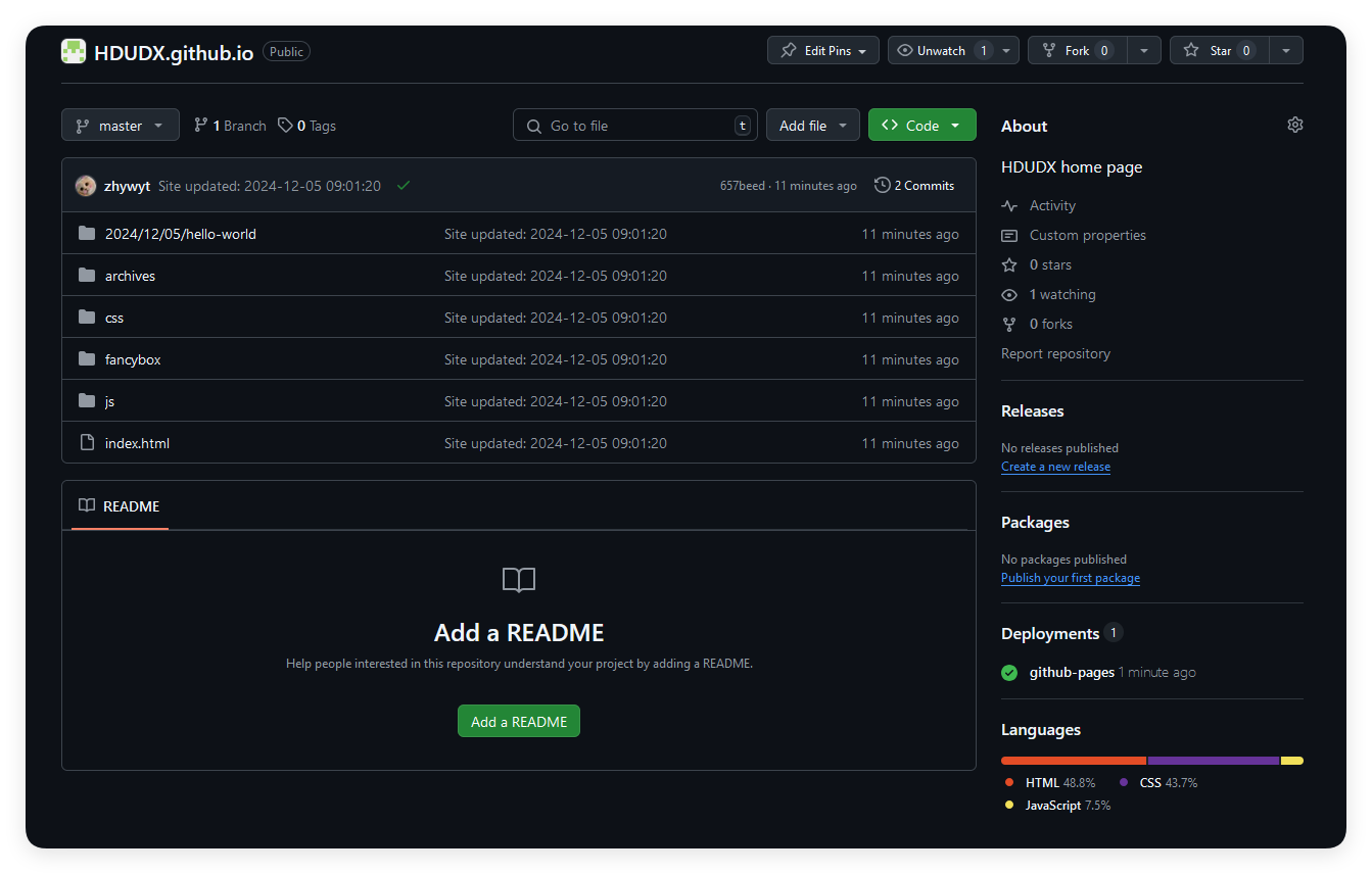 我们使用hexo d实现的其实只是将我们的public里的文件上传到github上,但是我们的Markdown文件其实无法保存在云端,这个时候就有一个天才站出来了,说:我们用两个分支,分别存储源码和前端不就好了吗?于是这个解决办法就这样孕育而生了: