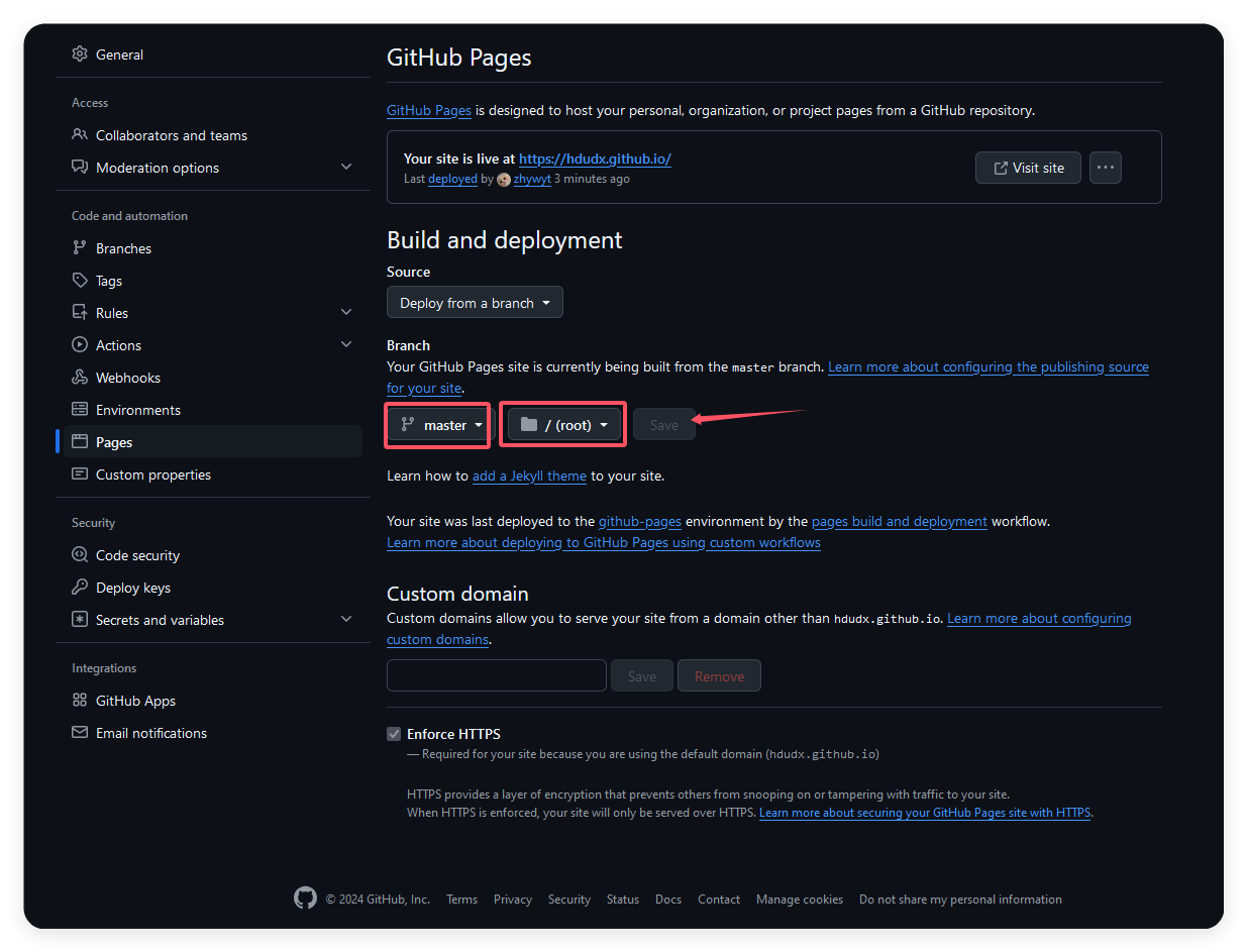 此时你迫不及待地打开专属你的网址,可能出现404,不要沮丧,打开你的项目设置,找到Pages,选择正确的分支和文件夹,并保存。不出意外的话在1分钟后就会得到正确的结果了!可以尝试访问我们的网站:杭州电子科技大学定向队。