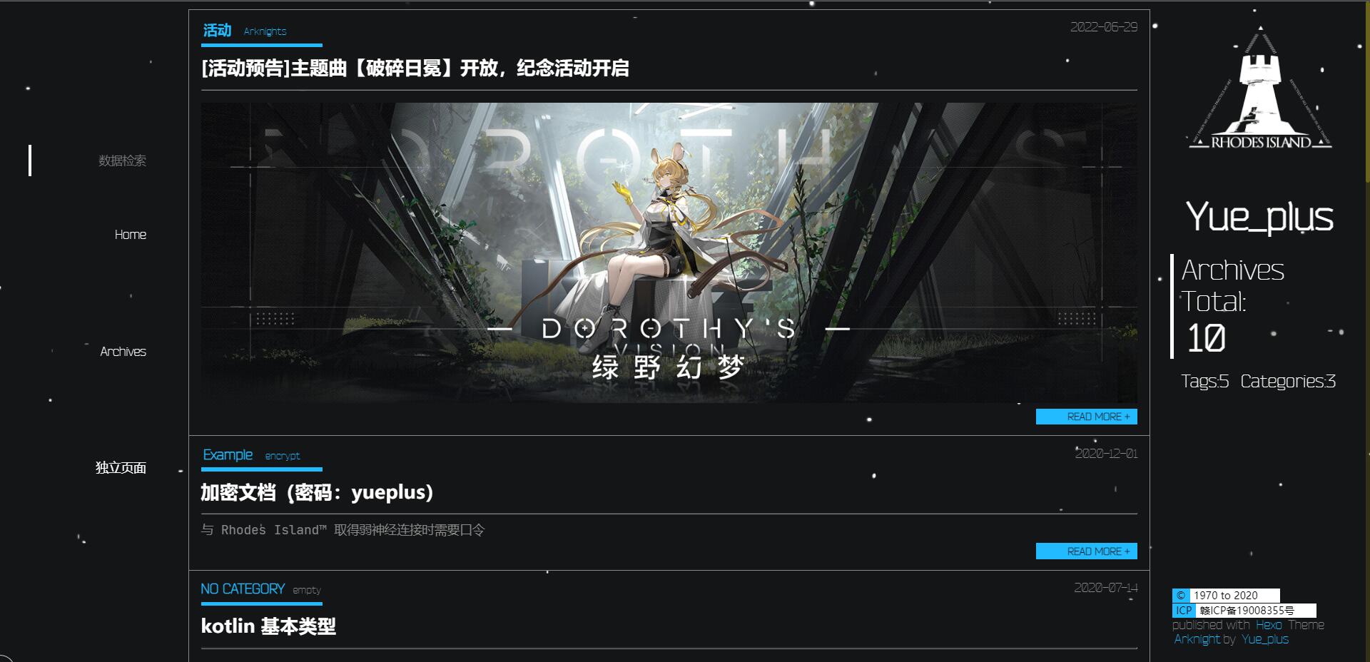 GitHub - Yue-plus/hexo-theme-arknights: 明日方舟罗德岛阵营的 Hexo 主题,支持数学公式、Valine&Gitalk&Waline评论系统、Mermaid图表